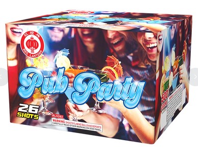 Gather your friends for this Pub Party! 25 shots of neon color bursts with golden strobes, followed by triple red/blue peonies with white lace! The party really gets going with strobing nishikis and a built-in finale to call it a night!