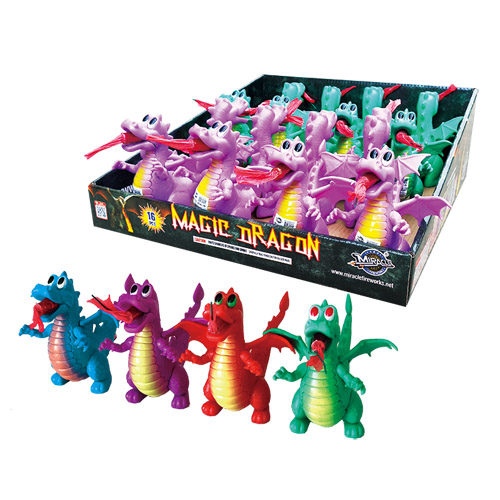 This magic dragon puts on a fun show and comes in assorted colors! Silver spring with red pistil, red spring, blue smoke, crackle with red and green